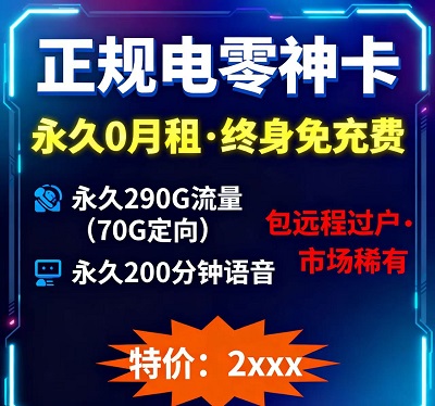 正规电零神卡:永久0月租,永久290G流量(其中70G定向),永久200分钟语音,包远程过户,特价:2xxx 正规永久0月租,市场稀有,终身免充费,自用很划算!