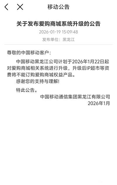 中国移动黑龙江公司计划于2026年1月22日起对爱购商城相关系统进行升级,升级后IP超市等资费将不能订购爱购商城权益产品。