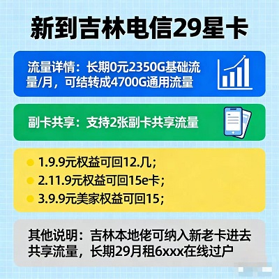 在吉林过日子,流量不够用简直寸步难行——刷短视频、导航查路线、家庭监控连网、孩子上网课,哪样离得开流量?现在吉林电信放大招,29星卡直接把“流量自由”拉到地板价:长期月租29元不涨价,每月自带2350G基础流量,用不完还能结转,最高能攒到4700G通用流量!不管是刷剧、直播还是开热点,这么多流量随便造,再也不用为“流量焦虑”抠抠搜搜,吉林本地佬直接闭眼冲,这波长期福利错过真的要拍大腿!