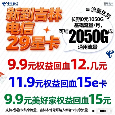 在吉林过日子,流量不够用真的太憋屈——通勤刷短视频、周末自驾导航、家里监控连网、孩子线上学习,哪样离得开流量?现在吉林电信放大招,29星卡直接把“流量自由”打下来!长期29元月租不涨价,每月0元享1050G基础流量,用不完还能自动结转,累计可达2050G通用流量!没有定向限制,刷剧、直播、开热点随便造,吉林本地佬闭眼冲,这波长期福利错过真的要拍大腿!