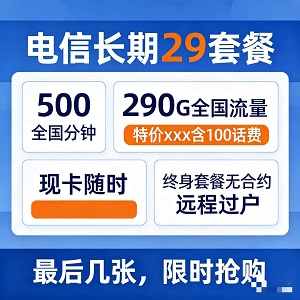 最后几张电信长期𝟮𝟵套餐500全国分钟290G全国流量
